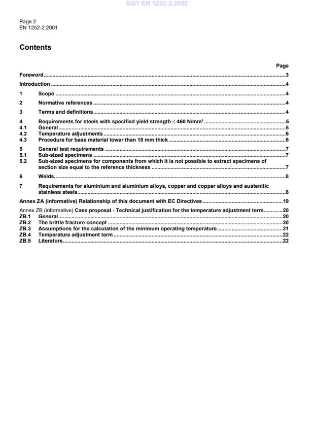 460 N/mm².54.1General.54.2Temperature adjustments.64.3Procedure for base material lower than 10 mm thick.65General test requirements.75.1Sub-sized specimens.75.2Sub-sized specimens for components from which it is not possible to extract specimens ofsection size equal to the reference thickness.76Welds.87Requirements for aluminium and aluminium alloys, copper and copper alloys and austeniticstainless steels.8Annex ZA (informative) Relationship of this document with EC Directives.19Annex ZB (informative) Case proposal - Technical justification for the temperature adjustment term.20ZB.1General.20ZB.2The brittle fracture concept.20ZB.3Assumptions for the calculation of the minimum operating temperature.21ZB.4Temperature adjustment term.22ZB.5Literature.22SIST EN 1252-2:2002
