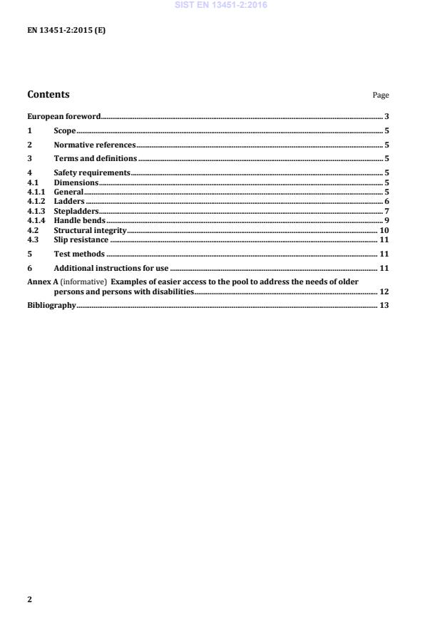 This part of EN 13451 specifies safety requirements for ladders, stepladders and handle bends in addition to the general safety requirements of EN 13451-1. The requirements of this specific standard take priority over those in EN 13451-1. This part of EN 13451 is applicable to manufactured ladders, stepladders and handle bends used for pool access and egress for use in classified swimming pools as specified in EN 15288-1 and EN 15288-2.