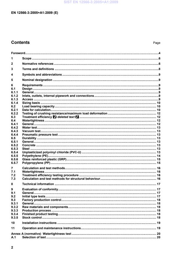 Clauses of this European Standard addressing the provisions of the EU Construction Products Directive . 39ZA.1Scope and relevant characteristics . 39ZA.2Procedure of attestation of conformity of !!!!packaged and/or site assembled domestic wastewater treatment plants"""" . 41ZA.2.1System of attestation of conformity . 41ZA.2.2Declaration of conformity . 41ZA.3CE Marking . 42Bibliography . 45 SIST EN 12566-3:2005+A1:2009