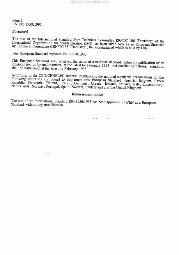 EN ISO 3950:1997 is a standard published by the European Committee for Standardization (CEN). Its full title is "Dentistry - Designation system for teeth and areas of the oral cavity (ISO 3950:1995)". This standard covers: Migrated from Progress Sheet (TC Comment) (2000-07-10): Revision of EN 23950:1990.
