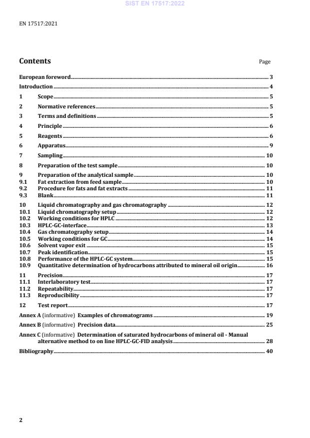 EN 17517:2021 is a standard published by the European Committee for Standardization (CEN). Its full title is "Animal feeding stuffs: Methods of sampling and analysis - Determination of mineral oil saturated hydrocarbons (MOSH) and mineral oil aromatic hydrocarbons (MOAH) with on-line HPLC-GC-FID analysis". This standard covers: This document specifies a method for the determination of saturated and aromatic hydrocarbons (from C10 to C50) in feed. The method has been interlaboratory validated with on-line-HPLC-GC-FID – see [1], [2] and [3]. This method is not intended to be applied to other matrices. The method can be used for the analysis of mineral oil saturated hydrocarbons (MOSH) and/or mineral oil aromatic hydrocarbons (MOAH). The method is applicable for feed materials, in particular vegetable oils and other fat rich feed materials, compound feeds and pre-mixtures. It is not applicable to additives or deodistillates. NOTE 1 The method was not designed for encapsulated matrices. The method has been tested in an interlaboratory study via the analysis of both naturally contaminated and spiked samples (pre-mixture, soybean meal, sunflower seeds, chicken feed, pig feed, vegetable oil) ranging from 3 mg/kg to 286 mg/kg for MOSH and from 1 mg/kg to 16 mg/kg for MOAH. According to the results of the interlaboratory study, the method has been proven suitable for MOSH and MOAH mass concentrations, each above 10 mg/kg. However, the method was not fully validated during the collaborative study for the premixture sample due to too low concentrations of MOSH and MOAH. The method was also not fully validated during the collaborative study for the sunflower seeds sample due to a too low concentration of MOAH. NOTE 2 The conclusions regarding MOAH are based on 4 analyte / matrix combinations while the IUPAC protocol [4] expects this to be a minimum of 5. In case of suspected interferences from natural sources, the fossil origin of the MOSH and MOAH fraction can be verified by examination of the pattern by GC-MS. For the determination of MOSH and MOAH in edible fats and oils, another CEN standard is also available: EN 16995. For more information see [5]. Annex C proposes a manual alternative method to on-line HPLC-GC-FID analysis that can be used as a screening method for the determination of MOSH.