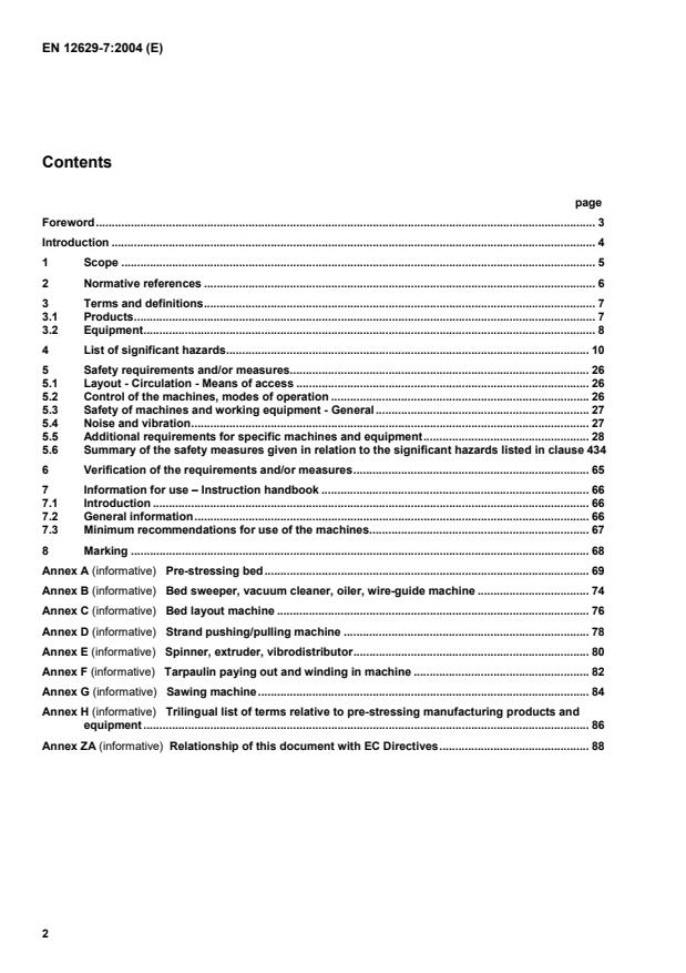 This European Standard is intended to be used together with EN 12629-1:2000 "Machines for the manufacture of constructional products from concrete and calcium-silicate - Safety - Part 1: Common requirements", which specifies general requirements of machines for the manufacture of constructional products from concrete and calcium-silicate. The manufacturing bed is a machine with which other associated machines work simultaneously. Moreover, these machines are generally used on beds installed in parallel. This standard gives particular requirements for the design of the following machines: - Pre-stressing bed (schematic representation is given in annex A); - Bed sweeper, vacuum cleaner, oiler, wire-guide machine (schematic representation is given in annex B); - Bed layout machine (schematic representation is given in annex C); - Strand pushing/pulling machine (schematic representation is given in annex D); - Spinner, extruder, vibrodistributor (schematic representation is given in annex E); - Tarpaulin paying out and winding in machine (schematic representation is given in annex F); - Sawing machine (schematic representation is given in annex G). NOTE The manufacturing operations include some or all of the following: - treating pre-stressing bed with release agent; - "marking out" the elements (slabs, plain slabs, etc.) to be made; - running the pre-stressing strands; - pre-tensioning; - installing the shutterings, (formwork, side shutters, end plates and inserts) - fixing reinforcement; - tensioning; - concrete distribution and compaction; - winding out the tarpaulin; - heating; - detensioning; - removal of shettering, formwork, etc. ; - strands cutting or sawing; - removal of final products; - bed cleaning. The concrete supply interface which is taken into account for safety is also considered.