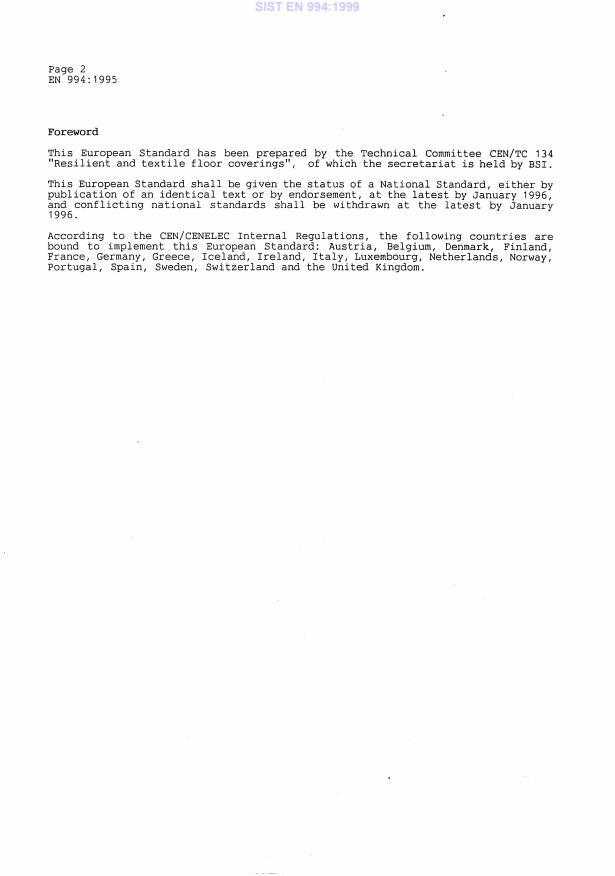 EN 994:1995 is a standard published by the European Committee for Standardization (CEN). Its full title is "Textiles floor coverings - Determination of the side length, squareness and straightness of tiles". This standard covers: This European Standard specifies a method for determining the length and straightness of the edges and the squareness of floor coverings in the form of right-angled tiles.