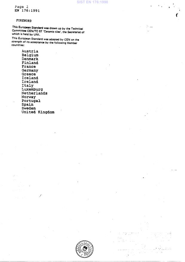EN 176:1991 is a standard published by the European Committee for Standardization (CEN). Its full title is "Dust-pressed ceramic tiles with a low water absorption (E<=3%) - Group BI". This standard covers: This European Standard specifies the sizes, dimensional tolerances, mechanical physical and chemical requirements, surface quality requirements and marking of ceramic tiles. It will also make reference to the slipperiness of the product.