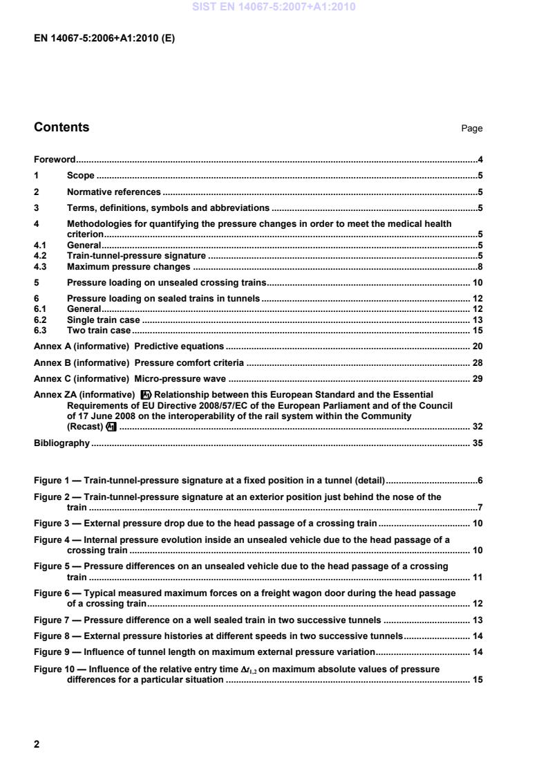 !!!!Relationship between this European Standard and the Essential Requirements of EU Directive 2008/57/EC of the European Parliament and of the Council of 17 June 2008 on the interoperability of the rail system within the Community (Recast)"""" . 32Bibliography . 35 Figure 1 — Train-tunnel-pressure signature at a fixed position in a tunnel (detail) .6Figure 2 — Train-tunnel-pressure signature at an exterior position just behind the nose of the train .7Figure 3 — External pressure drop due to the head passage of a crossing train . 10Figure 4 — Internal pressure evolution inside an unsealed vehicle due to the head passage of a crossing train . 10Figure 5 — Pressure differences on an unsealed vehicle due to the head passage of a crossing train . 11Figure 6 — Typical measured maximum forces on a freight wagon door during the head passage of a crossing train . 12Figure 7 — Pressure difference on a well sealed train in two successive tunnels . 13Figure 8 — External pressure histories at different speeds in two successive tunnels . 14Figure 9 — Influence of tunnel length on maximum external pressure variation . 14Figure 10 — Influence of the relative entry time ∆∆∆∆t1,2 on maximum absolute values of pressure differences for a particular situation . 15SIST EN 14067-5:2007+A1:2010