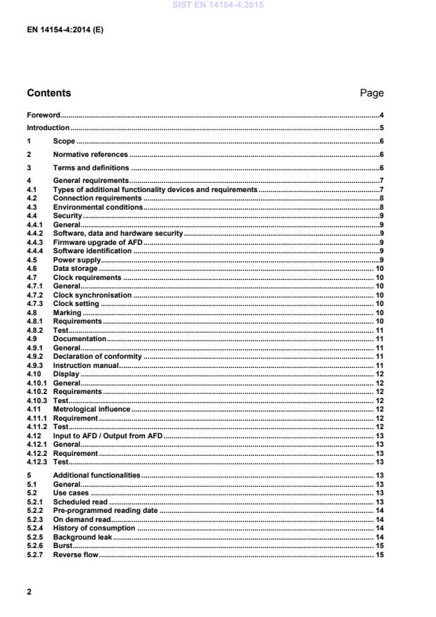 A manufacturer can claim compliance only for additional functionalities described in this European Standard. It is not mandatory that an AFD complies with all additional functionalities described herein. 2 Normative references The following documents, in whole or in part, are normatively referenced in this document and are indispensable for its application. For dated references, only the edition cited applies. For undated references, the latest edition of the referenced document (including any amendments) applies. EN 14154-1, Water meters – Part 1: General requirements EN 14154-2, Water meters – Part 2: Installation and conditions of use EN 14154-3, Water meters – Part 3: Test methods and equipment EN ISO 4064-1, Water meters for cold potable water and hot water - Part 1: Metrological and technical requirements (ISO 4064-1) EN ISO 4064-2, Water meters for cold potable water and hot water - Part 2: Test methods (ISO 4064-2) EN ISO 4064-4, Water meters for cold potable water and hot water - Part 4: Non-metrological requirements not covered in ISO 4064-1 (ISO 4064-4) EN ISO 4064-5, Water meters for cold potable water and hot water - Part 5: Installation requirements (ISO 4064-5) EN 60529:1991, Degrees of protection provided by enclosures (IP Code) (IEC 60529:1989) 3 Terms and definitions The terms, definitions and symbols of EN ISO 4064-1, EN ISO 4064-2, EN ISO 4064-4 and EN ISO 4064-5, EN 14154-1, EN 14154-2 and EN 14154-3 apply. NOTE Additionally for the purposes of this part of the European Standard, the following terms and definitions only related to additional functionalities apply. 3.1 functionality process which constantly or at defined intervals, automatically or on demand, performs specific activities such as sampling data, reading a data set, verifying or changing a status, or activating a switch 3.2 additional functionality functionality that a smart meter provides, over and above the metrological functionality covered by the Measuring Instruments Directive SIST EN 14154-4:2015