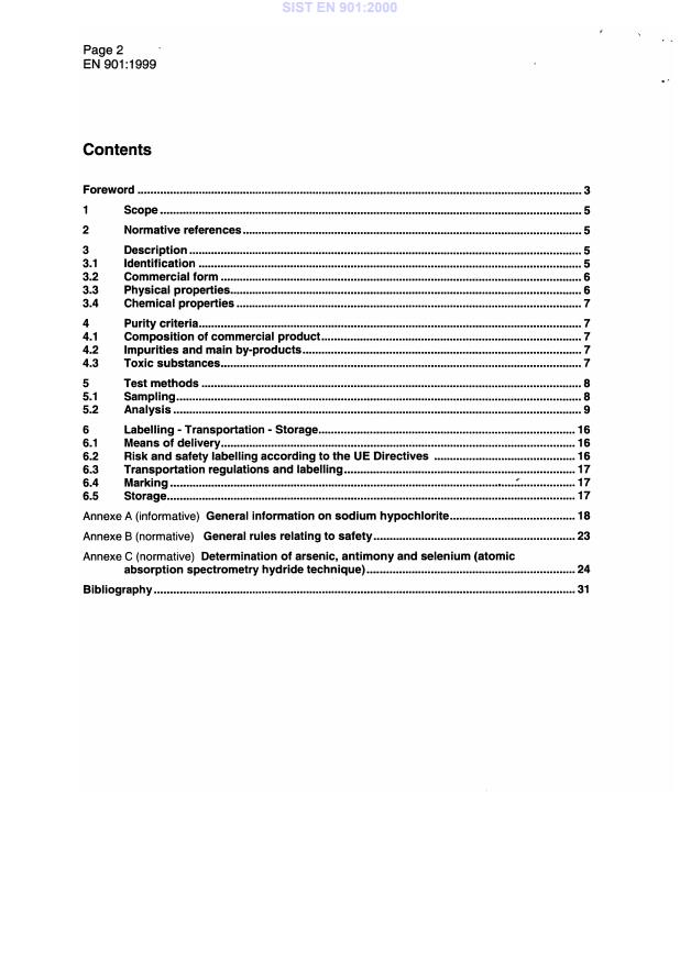 EN 901:1999 is a standard published by the European Committee for Standardization (CEN). Its full title is "Chemicals used for treatment of water intended for human consumption - Sodium hypochlorite". This standard covers: This European Standard is applicable to sodium hypochlorite used for treatment of water intended for human consumption. It describes the characteristics of sodium hypochlorite and specifies the requirements and the corresponding test methods for sodium hypochlorite. It gives information on its use in water treatment.