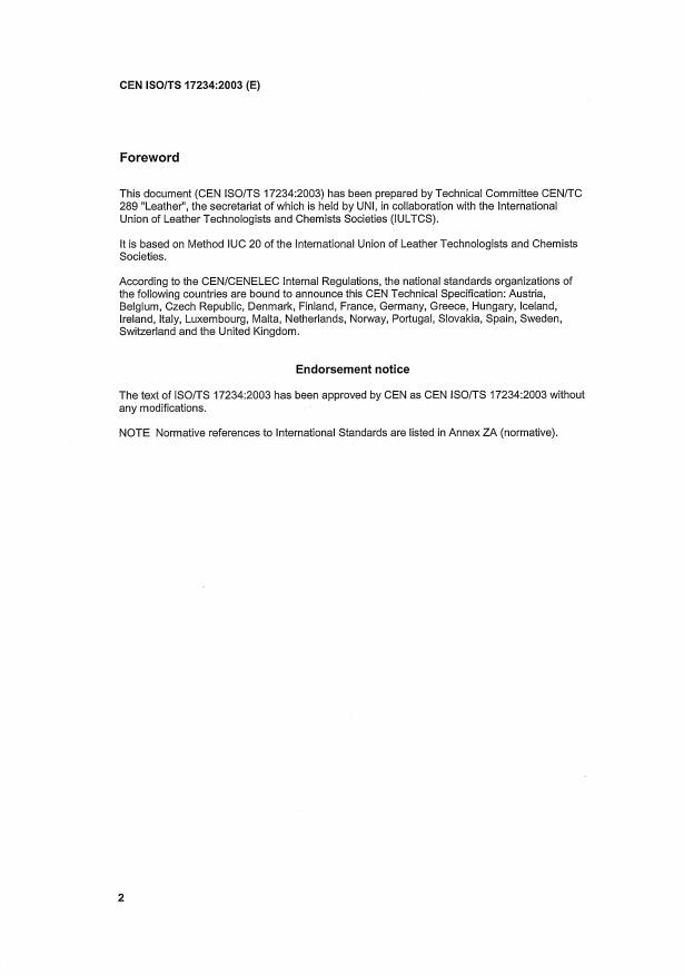 CEN ISO/TS 17234:2003 is a technical specification published by the European Committee for Standardization (CEN). Its full title is "Leather - Chemical tests - Determination of certain azo colourants in dyed leathers (ISO/TS 17234:2003)". This standard covers: Migrated from Progress Sheet (TC Comment) (2000-07-10): rev. draft BP: Item will be progressed in ISO and CEN under the V.A. 5.2 CEN lead at FV/FDIS stage, under prEN ISO 17234 (TA/990211) ++ VA/CEN (CC/010821) ++ CEN/TC 289 Res 8/2001: changed into ENV ++ CEN/TC 289 does not have any objection to change the ENVs into CEN/TS (CC/011008) ++ NOT TO BE PUBLISHED - WAIT FOR RESULT OF BT/TCMG (see BT C68/2002) (NT/020927) ++ Resolution BT 18/2002: The publication will be done under ISO lead - A draft foreword will be sent to CMC (MAL) for consultation with, and agreement by, UNI (CEN/TC 289 secretariat) before publication of the ISO std - ISO/CS should finalize the standard by 2002-12-31, otherwise CEN will publish the standards (NT/021014). After the closure of the vote, the VA/CEN-Lead is transferred into an VA/ISO-Lead and ISO/CS prepares the final version of the standard (GDJ/2003-01-22)