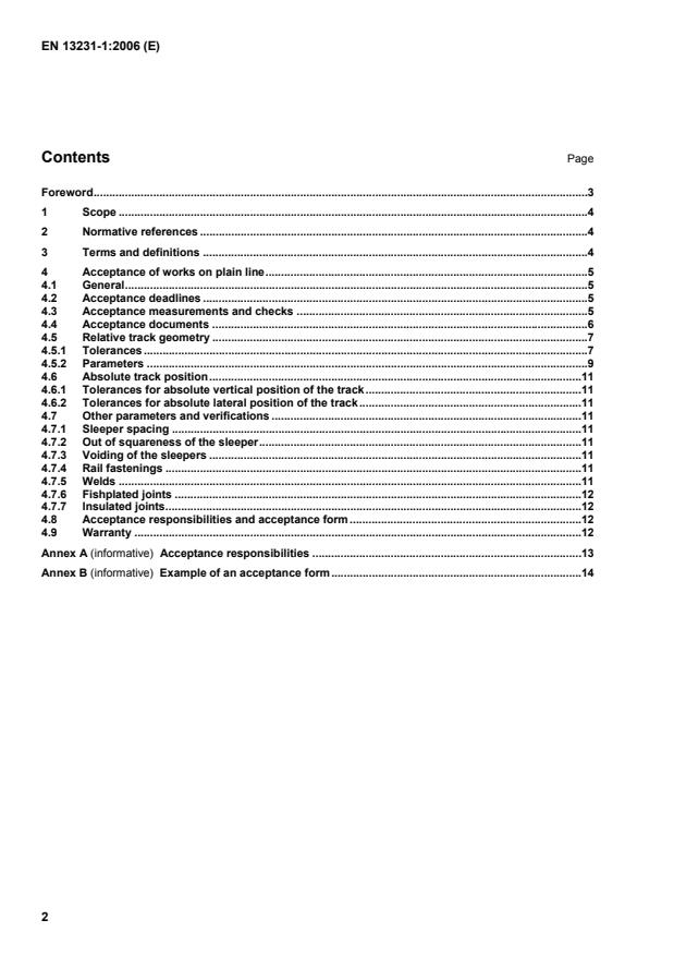 3.10 works on track works on track cover: initial construction; simultaneous or separated renewal of rails, sleepers, other components and ballast; tamping/levelling/lining/dynamic track stabiliser (DTS) work to correct track geometry; other works on the track, excluding works covered by EN 13231-3; welding. 4 Acceptance of works on plain line 4.1 General The requirements under this clause apply to works as defined in 3.10. Related works, e.g. platform reconstruction, formation, drainage, level crossings are not covered by this standard. The acceptance of welding work in conjunction with track works is covered by prEN 14730 (series) when available. An acceptance form shall be prepared for each item of work outlining the results achieved (see an example of this type of form in Annex B). Acceptance is not given until the work is completed in accordance with the requirements of the contract. 4.2 Acceptance deadlines Acceptance shall not be carried out until the track has been subjected to an appropriate passing tonnage, including the mechanically simulated loading (e.g. by a DTS), which shall be defined by the customer that permits clearance of the track for the maximum permitted speed. It is permitted for acceptance to occur within a period after the completion of the works as defined by the customer (i.e. after receipt of the application from the contractor), even if the appropriate passing tonnage has not been achieved. 4.3 Acceptance measurements and checks Before acceptance, the following measurements or checks shall be carried out when applicable (manually or by automatic means): relative track geometry;