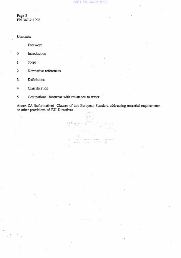 EN 347-2:1996 is a standard published by the European Committee for Standardization (CEN). Its full title is "Occupational footwear for professional use - Part 2: Additional specifications". This standard covers: This European Standard specifies, by reference to EN 344:1992 (1) and EN 344-2, additionnal requirements for occupational footwear, relating to water resistance. Basic and further optional requirements for occupational footwear are given in EN 347:1992 (1). (1) Subsequent to the issue of EN 344-2 and EN 347-2, EN 344:1992 and EN 347:1992 will be renumbered into Parts 1.