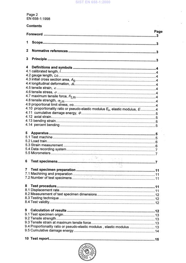 This European standard specifies the conditions for determining tensile properties of ceramic matrix composites (CMCs) with continuous fibre reinforcement at ambient (room) temperature. It applies to unidirectional (1D), bidirectional (2D) and tridirectional (xD, 2<x<=3) reinforced CMCs when loaded along a principal reinforcement axis. EN 658-1:1998 is widely implemented in national versions (e.g., SIST EN 658-1:2000).