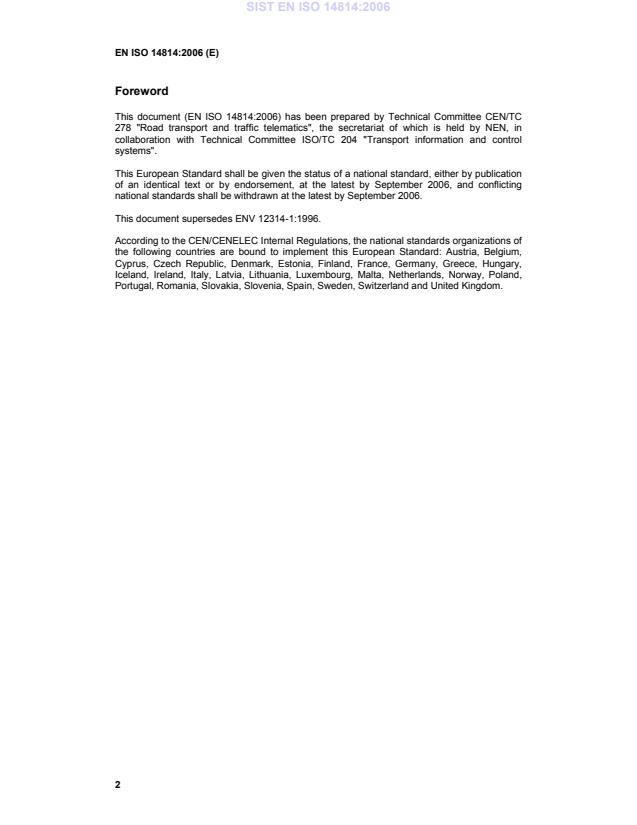 EN ISO 14814:2006 is a standard published by the European Committee for Standardization (CEN). Its full title is "Road transport and traffic telematics - Automatic vehicle and equipment identification - Reference architecture and terminology (ISO 14814:2006)". This standard covers: ISO 14814:2006 establishes a common framework to achieve unambiguous identification in ITS/RTTT (Intelligent Transport Systems/Road Transport and Traffic Telematics) AVI/AEI (Automatic Vehicle Identification/Automatic Equipment Identification) applications. This scheme and Reference Architecture Model is designed to be an "enabling" structure to allow interoperability between different commercial systems, and not prescriptive in determining any one system. It is not frequency- nor air interface protocol-specific, provides maximum interoperability, has a high population capability, and provides the possibility of upwards migration to more capable systems. ISO 14814:2006 provides a reference structure which enables an unambiguous identification and also identifies the data construct as an ITS/RTTT message. The construct also identifies which ITS/RTTT data structure is contained in the message.