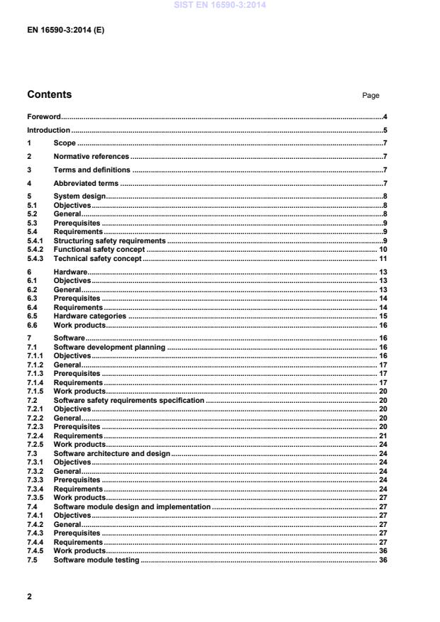 validation a The first of two numbers separated by a slash refer to the respective part of EN 16590, and the second to the clause in that document: 2/6 is EN 16590-2:2014/Clause 6, 3/5 is EN 16590-3:2014/Clause 5, and so on. Figure 1 — Structuring of safety requirements 5.3 Prerequisites Before beginning system design, define the safety-related function requirements, application and operation environment. 5.4 Requirements 5.4.1 Structuring safety requirements The functional safety concept specifies the basic functioning of the safety-related system with which the safety goals are to be fulfilled. The basic allocation of functional safety requirements to the system architecture is specified by the technical safety concept in the form of technical safety requirements. This system architecture is comprised of both hardware and software. The hardware safety requirements refine and solidify the requirements of the technical safety concept. Clause 6 describes how to specify the hardware requirements in detail. The software safety requirements are derived from the requirements of the technical safety concept and the underlying hardware. The requirements for the software defined in Clause 7 shall be taken into account. SIST EN 16590-3:2014