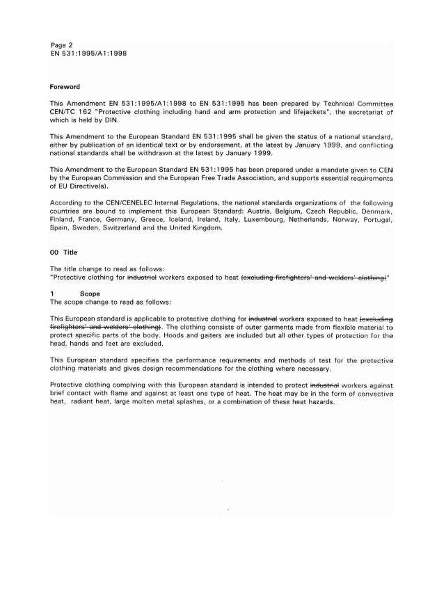 EN 531:1995/A1:1998 is a amendment published by the European Committee for Standardization (CEN). Its full title is "Protective clothing for workers exposed to heat". This standard covers: This European Standard is applicable to protective clothing for workers exposed to heat. The clothing consists of outer garments made from flexible material to protect specific parts of the body. Hoods and gaiters are included but all other types of protection for the head, hands and feet are excluded. This European Standard specifies the performance requirements and methods of test for the protective clothing materials and gives design recommendations for the clothing where necessary.