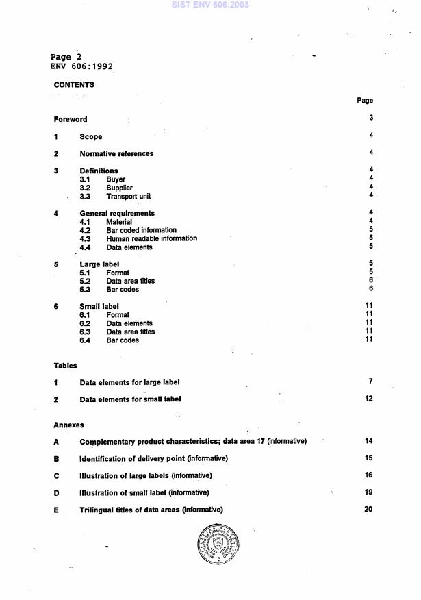 ENV 606:1992 is a standardization document published by the European Committee for Standardization (CEN). Its full title is "Bar coded transport and handling labels for steel products". This standard covers: This European prestandard specifies the requirements for labels containing human readable and bar coded information for fixing to steel products for the purpose of dispatch, transport and reception. It provides for two formats of label, that is, a large and samll label the application of which depends on the type, size and shape of the steel product. Data areas are defined and the associated information specified both as to content and characters to be used and where expressed in bar code the bar code identifiers and symbology are specified.