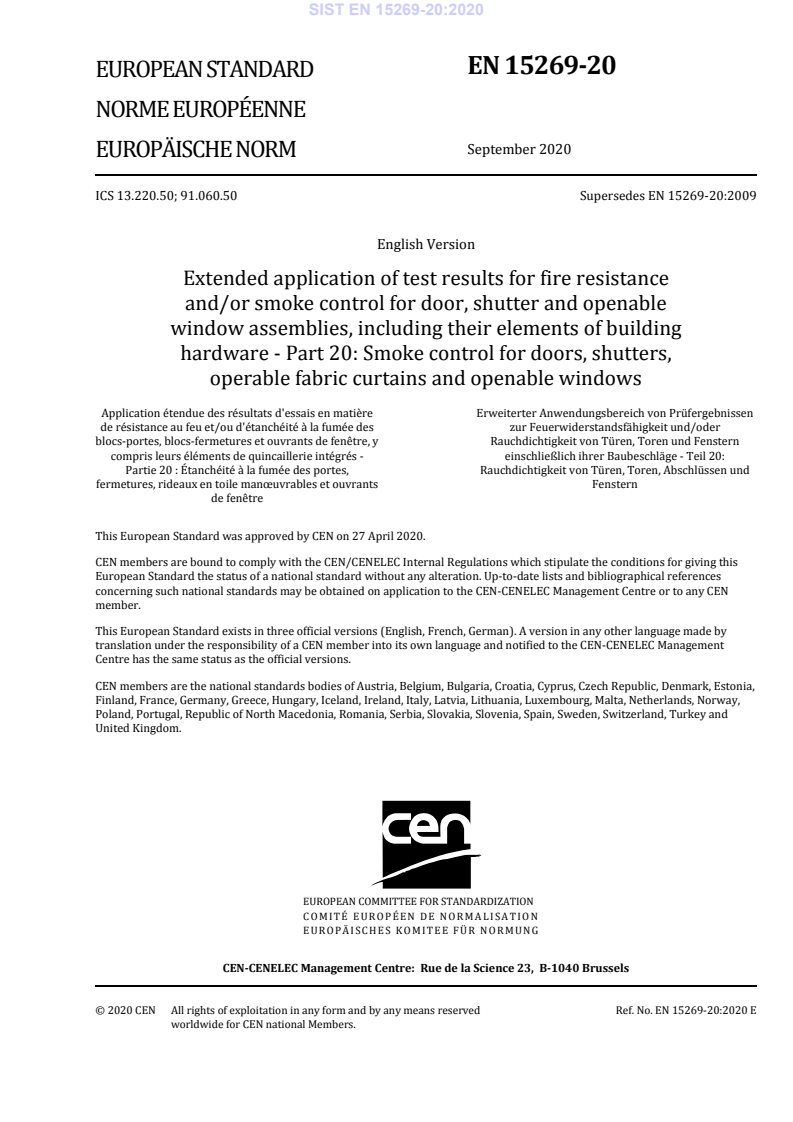 EN 15269-20:2020 defines the methodology for the extended application of smoke control test results for doors, shutters, operable fabric curtains and openable windows. Intended to be read with EN 15269‑1, this part covers a wide range of product types (hinged/pivoted, steel sliding, metal rolling shutters and operable fabric curtains) and prescribes how to apply results from smoke tests carried out to EN 1634‑3 to similar product variations without re-testing every permutation.