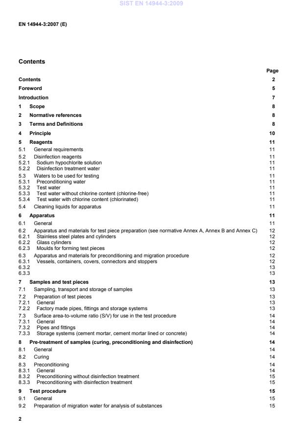 13 7 Samples and test pieces 13 7.1 Sampling, transport and storage of samples 13 7.2 Preparation of test pieces 13 7.2.1 General 13 7.2.2 Factory made pipes, fittings and storage systems 13 7.3 Surface area-to-volume ratio (S/V) for use in the test procedure 14 7.3.1 General 14 7.3.2 Pipes and fittings 14 7.3.3 Storage systems (cement mortar, cement mortar lined or concrete) 14 8 Pre-treatment of samples (curing, preconditioning and disinfection) 14 8.1 General 14 8.2 Curing 14 8.3 Preconditioning 14 8.3.1 General 14 8.3.2 Preconditioning without disinfection treatment 15 8.3.3 Preconditioning with disinfection treatment 15 9 Test procedure 15 9.1 General 15 9.2 Preparation of migration water for analysis of substances 15 SIST EN 14944-3:2009