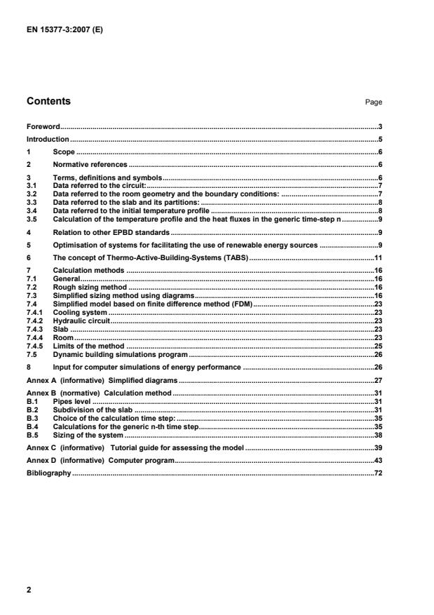 A section in the present standard describes how the design and dimensioning can be improved to facilitate renewable energy sources. Peak loads can be reduced by activating the building mass using pipes embedded in the main concrete structure of the building (Thermo-Active-Building-Systems, TABS). For this type of systems, the steady state calculation of heating and cooling capacity (part 1 of this standard) is not sufficient. Thus, several sections of this standard describe methods for taken into account the dynamic behavior. The proposed methods are used to calculate and verify that the cooling capacity of the system is sufficient and to calculate the cooling requirements on the water side for sizing the cooling system. The energetic assessment of surface heating and cooling systems may also be carried out according to national guidelines accomplishing the goal of this standard.
