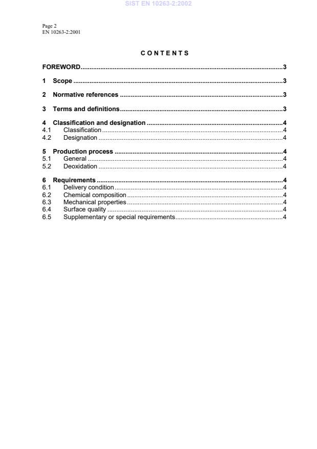 Page 2EN 10263-2:2001C O N T E N T SFOREWORD.31Scope.32Normative references.33Terms and definitions.34Classification and designation.44.1Classification.44.2Designation.45Production process.45.1General.45.2Deoxidation.46Requirements.46.1Delivery condition.46.2Chemical composition.46.3Mechanical properties.46.4Surface quality.46.5Supplementary or special requirements.4SIST EN 10263-2:2002