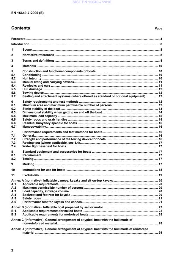 NOTE 1 Typical products forming class E: inflatable boats for rowing or paddling of near oval shape with or without transom; canoes and kayaks; inflatable boats made from plastic sheets or from reinforced materials; motor kit/sail kit as additional option. NOTE 2 Typical places for application of Class E devices: moving from A to B for pleasure purposes; staying on the water for relaxing; moving from shore to the main water craft, transportation of persons and load (tender boat). 2 Normative references The following referenced documents are indispensable for the application of this document. For dated refer-ences, only the edition cited applies. For undated references, the latest edition of the referenced document (including any amendments) applies. EN 15649-1:2009, Floating leisure articles for use on and in the water — Part 1: Classification, materials, general requirements and test methods EN 15649-2, Floating leisure articles for use on and in the water — Part 2: Consumer information EN ISO 8665, Small craft — Marine propulsion reciprocating internal combustion engines — Power meas-urements and declarations (ISO 8665:2006) 3 Terms and definitions For the purposes of this document, the terms and definitions given in EN 15649-1:2009 and the following ap-ply. 3.1 residual buoyancy provision of remaining buoyancy in case of a defect of any buoyancy chamber 3.2 inflatable boat buoyant structure (hull), achieving all or part of its intended shape and buoyancy by the medium of inflation and intended for the transportation of persons on the water; its design and shape give it the capability to with-stand forces and movements arising from various sea conditions SIST EN 15649-7:2010