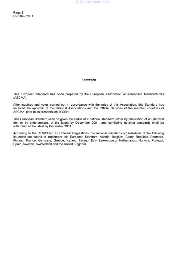 Page 2EN 2049:2001ForewordThis European Standard has been prepared by the European Association of Aerospace Manufacturers(AECMA).After inquiries and votes carried out in accordance with the rules of this Association, this Standard hasreceived the approval of the National Associations and the Official Services of the member countries ofAECMA, prior to its presentation to CEN.This European Standard shall be given the status of a national standard, either by publication of an identicaltext or by endorsement, at the latest by December 2001, and conflicting national standards shall bewithdrawn at the latest by December 2001.According to the CEN/CENELEC Internal Regulations, the national standards organizations of the followingcountries are bound to implement this European Standard: Austria, Belgium, Czech Republic, Denmark,Finland, France, Germany, Greece, Iceland, Ireland, Italy, Luxembourg, Netherlands, Norway, Portugal,