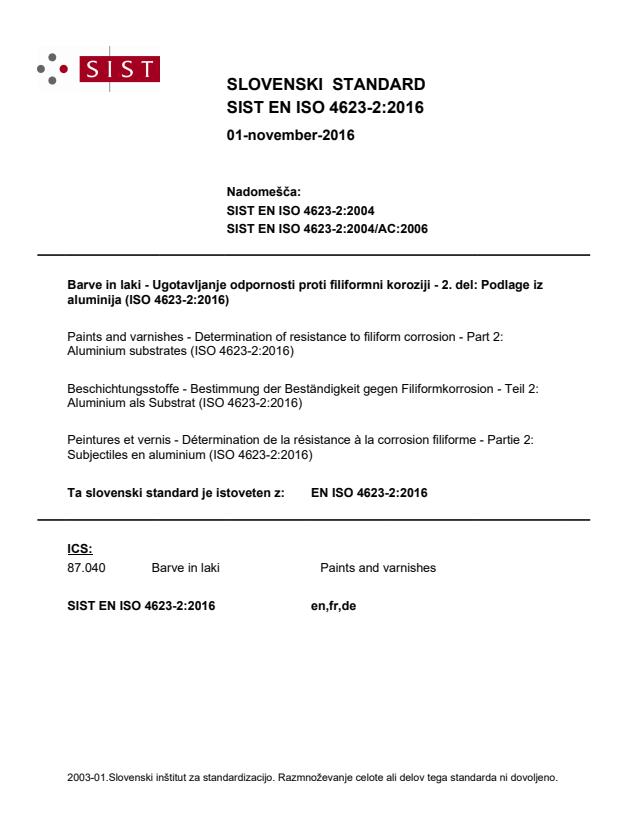 Barve in laki - Ugotavljanje odpornosti proti filiformni koroziji - 2. del: Podlage iz aluminija (ISO 4623-2:2016)