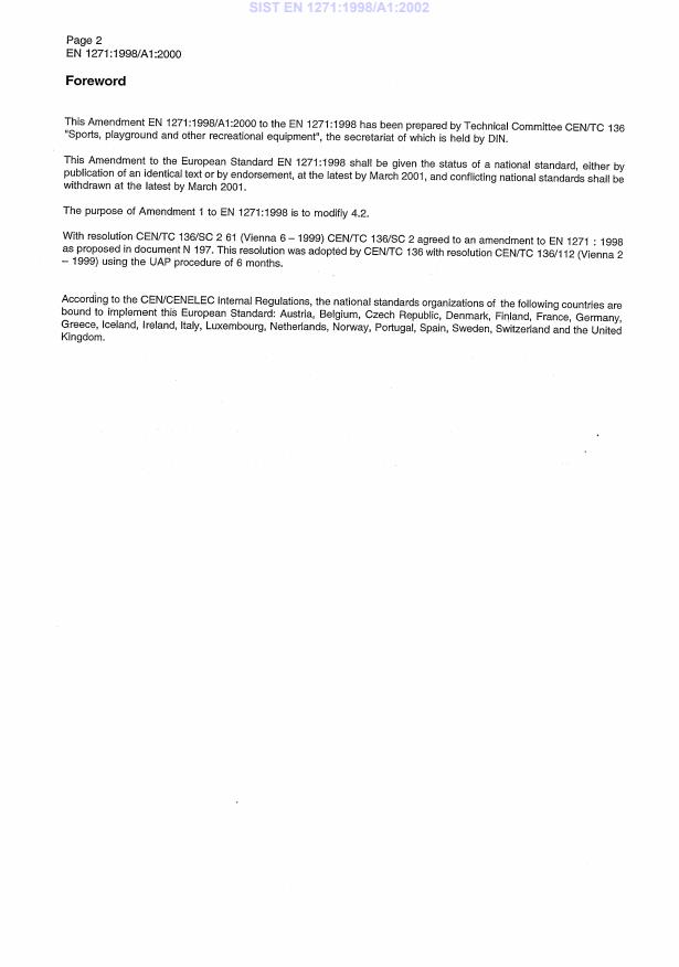 EN 1271:1998/A1:2000 is a amendment published by the European Committee for Standardization (CEN). Its full title is "Playing field equipment - Volleyball equipment - Functional and safety requirements, test methods". This standard covers: Migrated from Progress Sheet (TC Comment) (2000-07-10): UAP of 6 months (TC Res C 118/1999) (CC/990831)