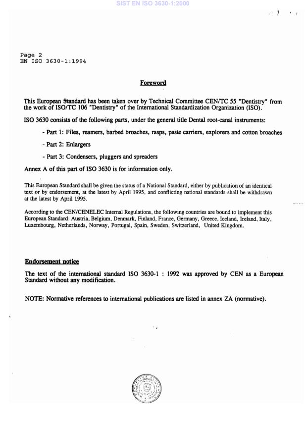 EN ISO 3630-1:1994 is a standard published by the European Committee for Standardization (CEN). Its full title is "Dental root-canal instruments - Part 1: Files, reamers, barbed broaches, rasps, paste carriers, explorers and cotton broaches (ISO 3630-1:1992)". This standard covers: Dental root-canal instruments - Part 1: Files, reamers, barbed broaches, rasps, paste carriers, explorers and cotton broaches (ISO 3630-1:1992)