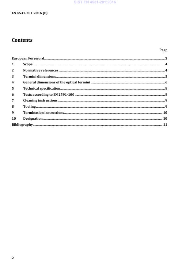 Page European Foreword . 3 1 Scope . 4 2 Normative references . 4 3 Termini dimensions . 5 4 General dimensions of the optical termini . 6 5 Technical specification . 8 6 Tests according to EN 2591-100 . 8 7 Cleaning instructions . 9 8 Tooling . 9 9 Termination instructions . 10 10 Designation. 10 Bibliography . 11