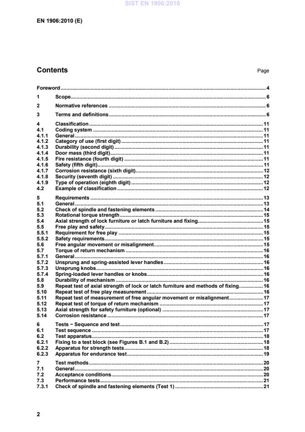 Ta evropski standard opredeljuje preskusne metode in zahteve za vretena in pritrditvene elemente, obratovalne vrtilne momente, dopustno prosto delovanje in varnost, prosto kotno gibanje in neporavnanost, trajnost, statično trdnost in odpornost proti koroziji za vzmetene in nevzmetene kljuke in bunke za vrata na čelnih ploščah ali rozetah. Ta standard se uporablja samo za kljuke in bunke, ki delujejo z zapahom ali ključavnico. Navaja štiri kategorije uporabe glede na pogostost in druge pogoje uporabe. Skladnost s tem evropskim standardom zagotavlja presežek trdnosti, potrebne za običajno obratovanje. Dodatne zahteve so potrebne za posebno varnostno opremo, ki je primerna za uporabo v situacijah, kjer je veliko tveganje padca. Ker posebna varnostna oprema ni bistvenega pomena v vsaki situaciji, ta evropski standard predpisuje dodatne varnostne zahteve (glej 5.13), ki so potrebne samo, kadar proizvajalec izjavi, da se za varnostno opremo trdi, da je skladna s temi zahtevami. Ta standard navaja pet razredov varnosti. Razred 0 v skladu z zahtevami navedenimi v glavnem delu tega standarda. Razredi od 1 do 4 so navedeni v skladu z zahtevo za opremo z varnostno ključavnico, za uporabo na vratih, odpornih proti vlomu (glej Dodatek A). Te dodatne varnostne zahteve so potrebne samo, kadar proizvajalec navaja, da se za izdelke trdi, da imajo visoko stopnjo varnosti, kar ni bistvenega pomena v vsaki situaciji. Primernost ključavnic in zapahov za uporabo na sklopih dimnih/požarnih vrat je določena s preskusi požarne odpornosti, ki so izvedeni poleg preskusov delovanja, ki jih zahteva ta standard. Ker primernost za uporabo na sklopih dimnih/požarnih vrat ni bistvenega pomena v vsaki situaciji, ima proizvajalec izbiro navesti ali se za opremo trdi, da je skladna s temi dodatnimi zahtevami ali ne. Če je to navedeno, so potrebne dodatne zahteve, podane v dodatku C.