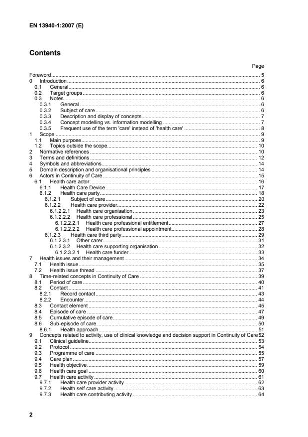 Page Foreword.5 0 Introduction.6 0.1 General.6 0.2 Target groups.6 0.3 Notes.6 0.3.1 General.6 0.3.2 Subject of care.6 0.3.3 Description and display of concepts.7 0.3.4 Concept modelling vs. information modelling.7 0.3.5 Frequent use of the term 'care' instead of 'health care'.8 1 Scope.9 1.1 Main purpose.9 1.2 Topics outside the scope.10 2 Normative references.10 3 Terms and definitions.12 4 Symbols and abbreviations.14 5 Domain description and organisational principles.14 6 Actors in Continuity of Care.15 6.1 Health care actor.16 6.1.1 Health Care Device.17 6.1.2 Health care party.18 6.1.2.1 Subject of care.20 6.1.2.2 Health care provider.22 6.1.2.2.1 Health care organisation.23 6.1.2.2.2 Health care professional.25 6.1.2.2.2.1 Health care professional entitlement.27 6.1.2.2.2.2 Health care professional appointment.28 6.1.2.3 Health care third party.29 6.1.2.3.1 Other carer.31 6.1.2.3.2 Health care supporting organisation.32 6.1.2.3.2.1 Health care funder.33 7 Health issues and their management.34 7.1 Health issue.35 7.2 Health issue thread.37 8 Time-related concepts in Continuity of Care.39 8.1 Period of care.40 8.2 Contact.41 8.2.1 Record contact.43 8.2.2 Encounter.44 8.3 Contact element.45 8.4 Episode of care.47 8.5 Cumulative episode of care.49 8.6 Sub-episode of care.50 8.6.1 Health approach.51 9 Concepts related to activity, use of clinical knowledge and decision support in Continuity of Care52 9.1 Clinical guideline.53 9.2 Protocol.54 9.3 Programme of care.55 9.4 Care plan.57 9.5 Health objective.59 9.6 Health care goal.60 9.7 Health care activity.61 9.7.1 Health care provider activity.62 9.7.2 Health self care activity.63 9.7.3 Health care contributing activity.64