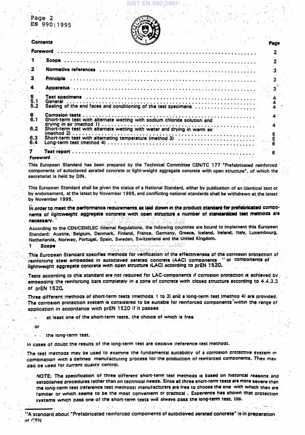 EN 990:1995 is a standard published by the European Committee for Standardization (CEN). Its full title is "Test methods for verification of corrosion protection of reinforcement in autoclaved aerated concrete and lightweight aggregate concrete with open structure". This standard covers: This European standard specifies methods for verification of the effectiveness of the corrosion protection of reinforcing steel embedded in autoclaved aerated concrete (AAC) components or components of lightweight aggregate concrete with open structure (LAC) according to prEN 1520. Tests according to this standard are not required for LAC-components if corrosion protection is achieved by embedding the reinforcing bars completely in a zone of concrete with closed structure according to 4.4.3.3 of prEN 1520.
