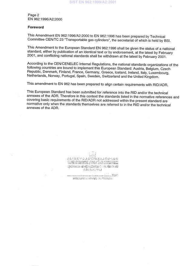 EN 962:1996/A2:2000 is a amendment published by the European Committee for Standardization (CEN). Its full title is "Transportable gas cylinders - Valve protection caps and valve guards for industrial and medical gas cylinders - Design, construction and tests". This standard covers: EN 962:1996 is being amended to address proposals made by the CEN consultant for alignment with RID/ADR.