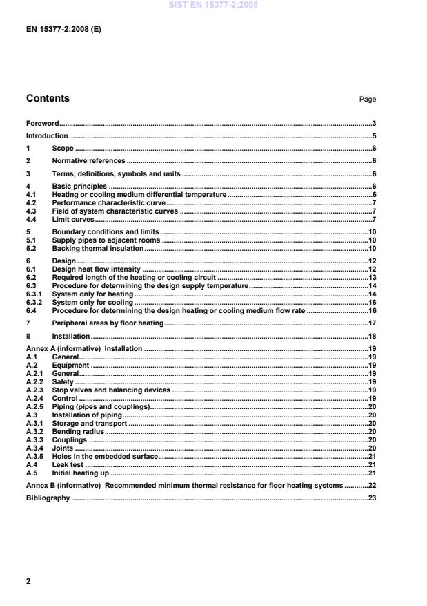 1 Scope This European Standard is applicable to water based surface heating and cooling systems in buildings as defined in EN 15377-1. Physiological limitations are taken into account when specifying the maximum and minimum surface temperature. The design is based on performance characteristic curves and limit curves calculated in accordance with EN 15377-1 and EN 1264. Design considerations for heating and cooling systems are specified. 2 Normative references The following referenced documents are indispensable for the application of this document. For dated references, only the edition cited applies. For undated references, the latest edition of the referenced document (including any amendments) applies. EN 1057, Copper and copper alloys — Seamless, round copper tubes for water and gas in sanitary and heating applications EN 1254 (all parts), Copper and copper alloys — Plumbing fittings EN 1264-2, Water based surface embedded heating and cooling systems — Part 2: Floor heating: Prove methods for the determination of the thermal output of floor heating systems using calculation and test methods EN 12828, Heating systems in buildings — Design for water-based heating systems EN 12831, Heating systems in buildings — Method for calculation of the design heat load EN 15377-1:2008, Heating systems in buildings — Design of embedded water based surface heating and cooling systems — Part 1: Determination of the design heating and cooling capacity EN ISO 13370, Thermal performance of buildings — Heat transfer via the ground — Calculation methods (ISO 13370:2007) ISO 17455, Plastics piping systems — Multilayer pipes — Determination of the oxygen permeability of the barrier pipe 3 Terms, definitions, symbols and units For the purposes of this document, the terms, definitions, symbols and units given in EN 15377-1:2008 apply. 4 Basic principles 4.1 Heating or cooling medium differential temperature The heating or cooling medium differential temperature Hθ∆ is calculated as follows (refer to EN 15377-1): SIST EN 15377-2:2008