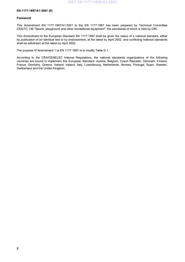 This amendment A1 modifies the European Standard EN 1177:1997; it was approved by CEN on 11 August 2001.