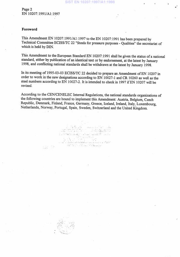 EN 10207:1991/A1:1997 is a amendment published by the European Committee for Standardization (CEN). Its full title is "Steels for simple pressure vessels - Technical delivery requirements for plates, strips and bars". This standard covers: Migrated from Progress Sheet (TC Comment) (2000-07-10): The draft will go immediately to FV because the modifications are only of ++ editorial nature. No revision of EN therefore, bec. the Amd. confirms it.