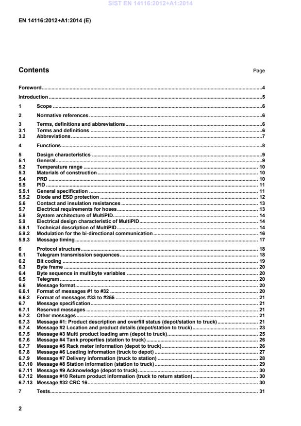 15 - PRD ESD protection resistance RESD kΩ 100 500 a All electrical contacts and wires. If hoses are used it includes also the hoses and couplings. b This equals the closed loop resistance RL within a safety factor of 10. c Between different PID scan channels and between any PID scan channel and ground. ! 5.7 Electrical requirements for hoses The electrical requirements for hoses used for loading and unloading shall be according to Table 6. Hose design should minimise the built up of electrical charge during product flow. Table 6 — Electrical requirements for hoses Parameter Unit Minimum Maximum Resistance between the couplings (end to end)a Ω 0 5 Resistance between signal path and the external surface of the hosec Ω 1 500 — Inductance between the couplings (end to end)a mH 0 0,4 Capacitancea, b nF 0 200 a These parameters are for single hoses and combinations of hoses, when the combination is used to make a single hose. These parameters shall also include the signal return line. b Hose coupling to ground or signal return path. c Measurement surrounding/measurement condition: clamp DN 78, 20 mm wide, tighten, preferable full-faced bearing. For other nominal diameters (DN) the clamp shall be coextensive, so appropriate smaller or expanded. " SIST EN 14116:2012+A1:2014