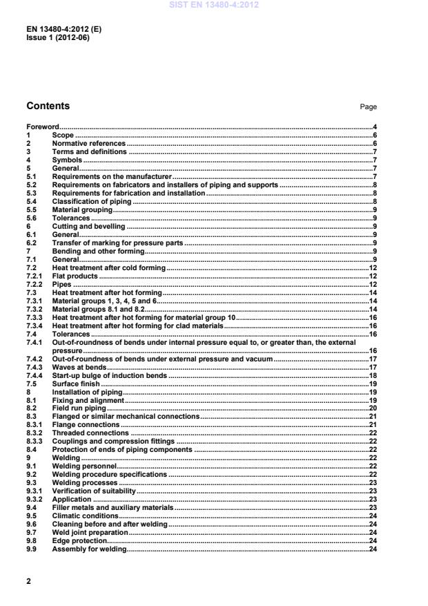 For material groups 3, 4 and 5, the heat affected zone shall be removed by machining or grinding. Plasma cutting shall be permitted for all material groups given in this European Standard. Plasma cutting shall be preceded by preheating, as specified for welding in 9.11.1. Other cutting and bevelling processes shall be permitted, provided their suitability is demonstrated. 6.2 Transfer of marking for pressure parts For pressure parts, identification of materials shall remain possible, either by retaining or by transferring the mark stipulated by the product standard, or by using a unique code kept in the records of the piping fabricator. Stamping shall not introduce a notching effect, therefore stamping with round edges is recommended. If any method of marking other than hard-stamping or engraving (vibrograph) is used, the fabricator shall ensure that confusion between different materials is not possible, e.g. by separate handling (time and/or place), stamped bands. 7 Bending and other forming 7.1 General 7.1.1 Fabricators of formed pressure parts shall have adequate equipment for the forming procedures and the subsequent heat treatment. NOTE 1 Forming of expansion bellows is specified in EN 13445-3:2009, clause 14. SIST EN 13480-4:2012