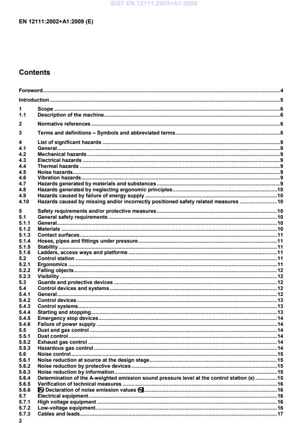 2 Contents Foreword . 4Introduction . 51Scope . 61.1Description of the machine . 62Normative references . 63Terms and definitions – Symbols and abbreviated terms . 84List of significant hazards . 94.1General . 94.2Mechanical hazards . 94.3Electrical hazards . 94.4Thermal hazards . 94.5Noise hazards . 94.6Vibration hazards . 94.7Hazards generated by materials and substances . 94.8Hazards generated by neglecting ergonomic principles . 104.9Hazards caused by failure of energy supply . 104.10Hazards caused by missing and/or incorrectly positioned safety related measures . 105Safety requirements and/or protective measures . 105.1General safety requirements . 105.1.1General . 105.1.2Materials . 105.1.3Contact surfaces . 115.1.4Hoses, pipes and fittings under pressure . 115.1.5Stability . 115.1.6Ladders, access ways and platforms . 115.2Control station . 115.2.1Ergonomics . 115.2.2Falling objects . 125.2.3Visibility . 125.3Guards and protective devices . 125.4Control devices and systems . 125.4.1General . 125.4.2Control devices . 135.4.3Control systems . 135.4.4Starting and stopping . 135.4.5Emergency stop devices . 145.4.6Failure of power supply . 145.5Dust and gas control . 145.5.1Dust control . 145.5.2Exhaust gas control . 145.5.3Hazardous gas control . 145.6Noise control . 155.6.1Noise reduction at source at the design stage . 155.6.2Noise reduction by protective devices . 155.6.3Noise reduction by information . 155.6.4Determination of the A-weighted emission sound pressure level at the control station (s) . 155.6.5Verification of technical measures . 165.6.6!!!!Declaration of noise emission values"""" . 165.7Electrical equipment . 165.7.1High voltage equipment . 165.7.2Low-voltage equipment . 165.7.3Cables and leads. 17SIST EN 12111:2003+A1:2009