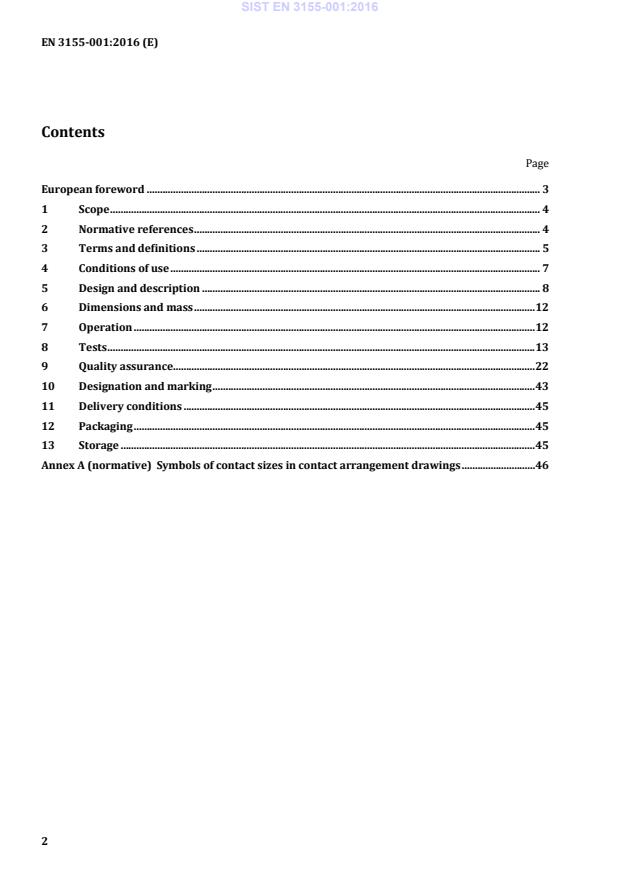 This European Standard specifies: the electrical, mechanical, environmental and dimensional characteristics of electrical contacts used in elements of connection, including coaxial, triaxial and quadrax contacts; the conditions for qualification, acceptance testing and quality assurance; the test programs and groups. It is applicable to removable crimp contacts, wrap contacts, solder contacts used in connectors or in other elements of electrical connection. In case of conflict or missing information between the EN 3155-001 and the product standards, the product standard shall govern. 2 Normative references The following documents, in whole or in part, are normatively referenced in this document and are indispensable for its application. For dated references, only the edition cited applies. For undated references, the latest edition of the referenced document (including any amendments) applies. EN 2083, Aerospace series — Copper or copper alloy conductors for electrical cables — Product standard EN 2242, Aerospace series — Crimping of electric cables with conductors defined by EN 2083, EN 4434 and EN 2346 EN 2424, Aerospace series — Marking of aerospace products EN 2591-100*, Aerospace series — Elements of electrical and optical connection — Test methods — Part 100: General EN 3197, Aerospace Series — Design and installation of aircraft electrical and optical interconnection systems