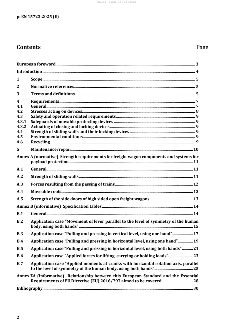 Keywords: prEN 15723, closing and locking devices, payload protecting devices, freight wagons, CEN, durability, maintenance, recycling, Annex A, status indication.