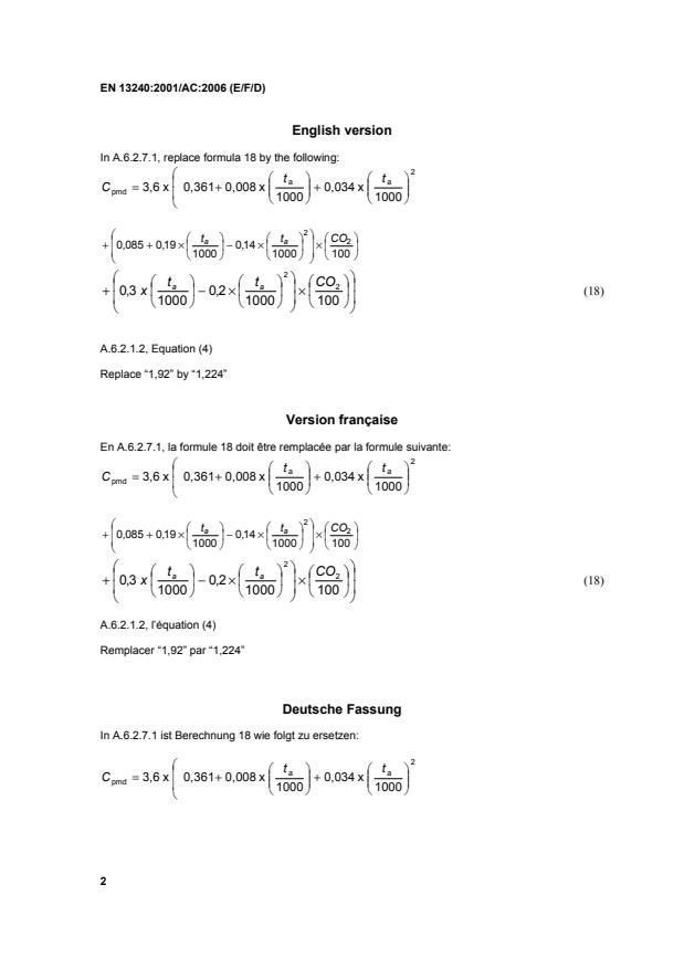 EN 13240:2001/AC:2006 is a corrigendum published by the European Committee for Standardization (CEN). Its full title is "Roomheaters fired by solid fuel - Requirements and test methods". This standard covers: TC - Modification to A.6.2.1.2, Equation 4