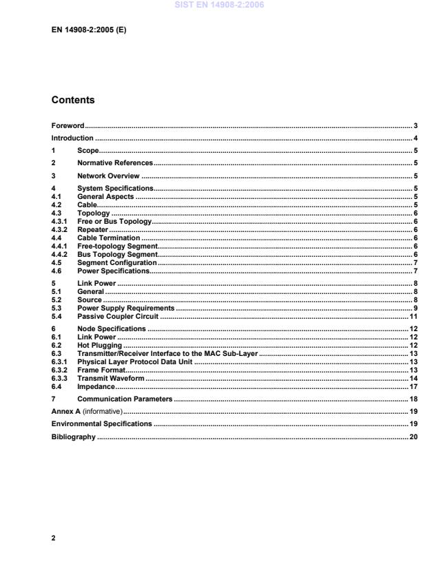 This European Standard specifies the control network protocol (CNP) free-topology twisted-pair channel and serves as a companion European Standard to prEN14908-1. The channel supports communication at 78.125 kbps between multiple nodes, each of which consists of a transceiver, a protocol processor, an application processor, a power supply, and application electronics.