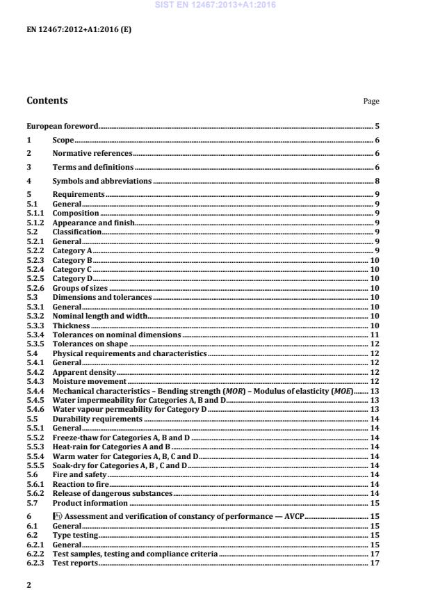 5 Requirements 5.1 General 5.1.1 Composition Sheets shall consist essentially of cement or a calcium silicate formed by a chemical reaction of a siliceous and a calcareous material, reinforced by fibres. The cement shall comply with EN 197-1 or with technical specifications relevant in the country of use. This European Standard covers fibre-reinforced cement flat sheets of type NT. The reinforcing fibres shall be one or more of the following forms: — discrete elements randomly dispersed; — continuous strands or tapes; — nets or webs. Process aids, fillers, aggregates and pigments may be added. 5.1.2 Appearance and finish The exposed face of the sheets can be with or without texture. The sheets can be coloured or left in their natural colour. The sheets can also receive adherent coloured or uncoloured coatings on their surface. Variations of the surface appearance which do not impair the fitness for purpose of the sheets are permitted. The sheets may be supplied with holes for fixing and/or cut to size. 5.2 Classification 5.2.1 General Sheets covered by this document are divided into: — four categories in accordance with their weather resistance (see 5.2.2 to 5.2.5); — five classes in accordance with their bending strength (see 5.4.3); — two groups of sizes in accordance with their method of installation (see 5.2.6); — two levels in accordance with their dimensional tolerances (see 5.3.4). Type tests for each category are specified in Table 7. 5.2.2 Category A Sheets which are intended for applications where they may be subjected to heat, high moisture and severe frost. SIST EN 12467:2013+A1:2016