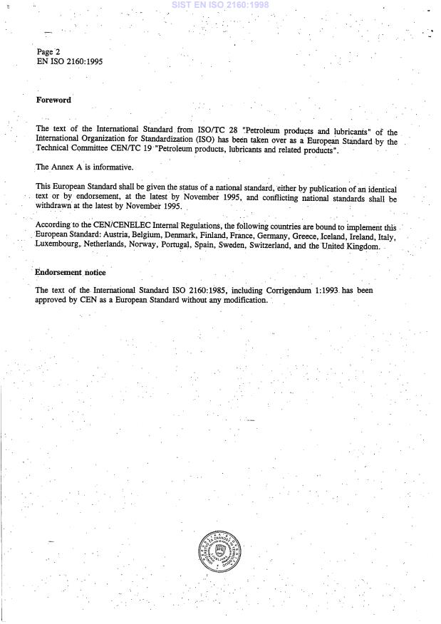 EN ISO 2160:1995 is a standard published by the European Committee for Standardization (CEN). Its full title is "Petroleum products - Corrosiveness to copper - Copper strip test (ISO 2160:1985, including Corrigendum 1:1993)". This standard covers: Migrated from Progress Sheet (TC Comment) (2000-07-10): Decision of BT to submit this ISO document to UAP procedure. ++ 960828: CEN/TC 19 Secr. decided to undergo // processing together with ++ ISO/TC 28 Secr.for the revision of EN ISO 2160:1995