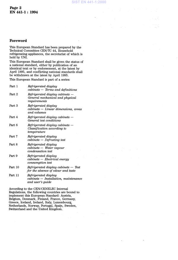 EN 441-2:1994 - Refrigerated display cabinets - Part 2: General mechanical and physical requirements - Effective Date