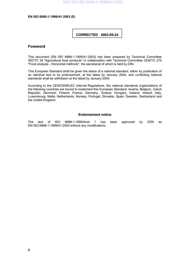 This amendment A1 modifies the European Standard EN ISO 6888-1:1999; it was approved by CEN on 2 June 2003.