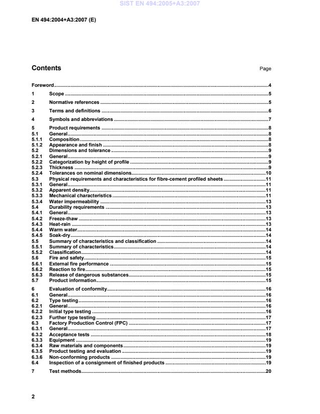 EN 494:2004+A3:2007 is a standard published by the European Committee for Standardization (CEN). Its full title is "Fibre-cement profiled sheets and fittings - Product specification and test methods". This standard covers: This document specifies the technical requirements and establishes methods of control and test as well as acceptance conditions for fibre-cement profiled sheets and their fibre-cement fittings for one or more of the following uses: - roofing, - internal wall finishes, - external wall and ceiling finishes. For the purpose of this document fibre-cement profiled sheets are classified according to their height of corrugation and their mechanical characteristics. This document covers fibre-cement profiled sheets reinforced with fibres of different type as specified in 5.1.1, with and without factory applied coating. This document does not include calculations with regard to works, design requirements, installation techniques, wind uplift or rain proofing of the installed sheets. NOTE Some of these requirements can be applied to curved sheets, after agreement between manufacturer and purchaser.
