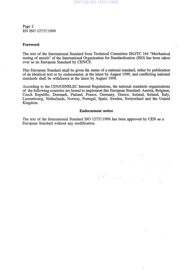 EN ISO 12737:1999 is a standard published by the European Committee for Standardization (CEN). Its full title is "Metallic materials - Determination of plane-strain fracture toughness (ISO 12737:1996)". This standard covers: 2009-10-23 SJ: Inter-standard links were missing. Revised version was published (WI EC001071), but this version was not withdrawn. Decision not to undertake corrective action (GM/MHT). Migrated from Progress Sheet (TC Comment) (2000-07-10): The results of the PQ has been submitted to ISO/TC 164/SC 4; but in the same time, ESIS had submitted a new version of their recommandation which resulted in CD 12737 "Determination of plane strain structure toughness" which incorporates the elements of EGF-P1:1990. It is actually prepared for the DIS vote. ++ The french translation is being prepared by AFNOR.