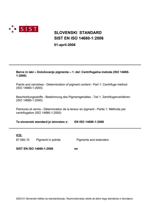 Barve in laki – Določevanje pigmenta – 1. del: Centrifugalna metoda (ISO 14680-1:2000)